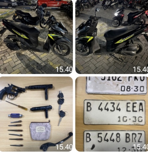 Polisi turut mengamankan sejumlah barang bukti berupa dua unit sepeda motor Honda Vario, alat-alat pembobol kendaraan, telepon genggam, serta benda menyerupai senjata api.