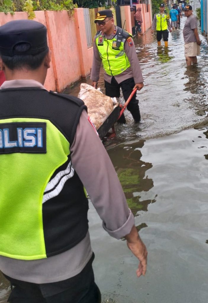 Personel Polres Pekalongan Kota di bawah komando Kapolsek Pekalongan Utara, Kompol Miyardi, S.H., bersama jajaran Koramil 19 Pekalongan Utara dan warga, memasang tanggul darurat menggunakan sandbag sebagai langkah cepat untuk menahan limpasan air. Total 900 sandbag dipasang pada titik-titik rawan yang menjadi jalur masuknya Rob ke pemukiman warga.