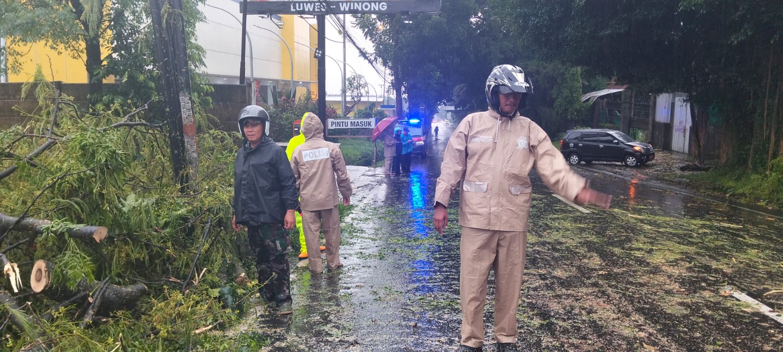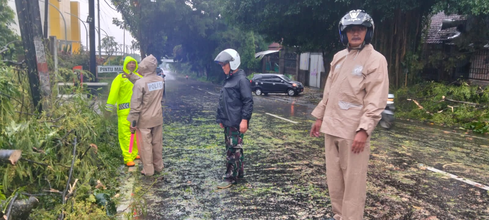 Aksi cepat dilakukan Babinsa Koramil 01/Kota Boyolali Kodim 0724/Boyolali Serma Oko Sutejo bersama Bhabinkamtibmas, personel BPBD, dan warga masyarakat saat sebuah pohon sengon berdiameter sekitar 80 cm tumbang dan menutup akses jalan Boyolali–Jatinom, tepatnya di Dukuh Tegalrejo, Desa Winong, Kecamatan Kota Boyolali, Jumat (5/12/25).