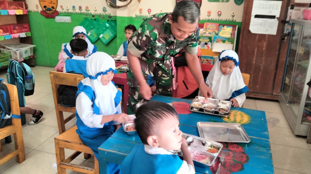 Sragen, Senin (13/10/2025) Dalam rangka mendukung program pemerintah untuk meningkatkan gizi anak-anak usia sekolah, Pelda Surasno dan Serda Sutrisno Babinsa Ngarum Koramil 07/Ngrampal Kodim 0725/Sragen turut mendampingi kegiatan pendistribusian makanan bergizi gratis di salah satu sekolah TK di wilayah binaannya. Kegiatan ini bertujuan untuk menumbuhkan kesadaran pentingnya asupan makanan sehat sejak dini, sekaligus membantu siswa agar lebih semangat dalam belajar.