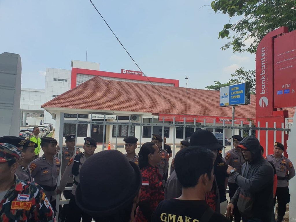 serang | Aksi damai yang digelar oleh Gerakan Moral Anti Kriminalitas (GMAKS) dan Kesatuan Komando Pembela Merah Putih di depan kantor bank banten memunculkan sorotan tajam terhadap dugaan penyimpangan anggaran pembangunan proyek Landscape serta belum dikantonginya izin PBG dan SLF Gedung Bank Banten.