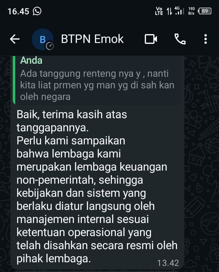 Salasatu petugas bank emok (BTPN)Mengirim tertulisnya Melawati whatsApp milik nya pada Jumat 7 Nov 2025.