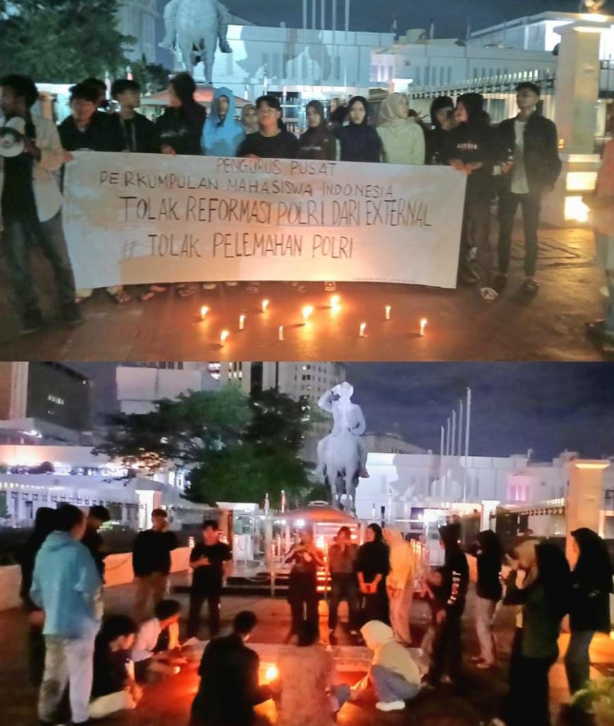 Mahasiswa PP – PMI Menggelar Aksi Menyalakan Lilin , ber orasi dan membentangkan Spanduk bertuliskan TOLAK REFORMASI POLRI DARI EKSTERNAL, DAN TOLAK PELEMAHAN POLRI,