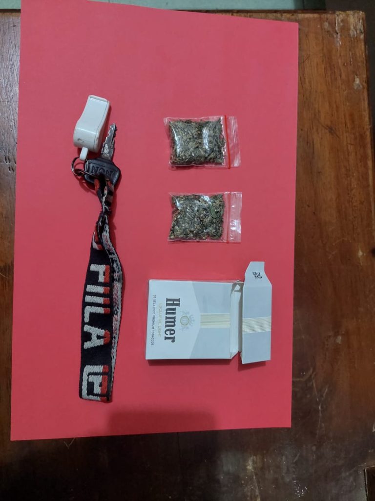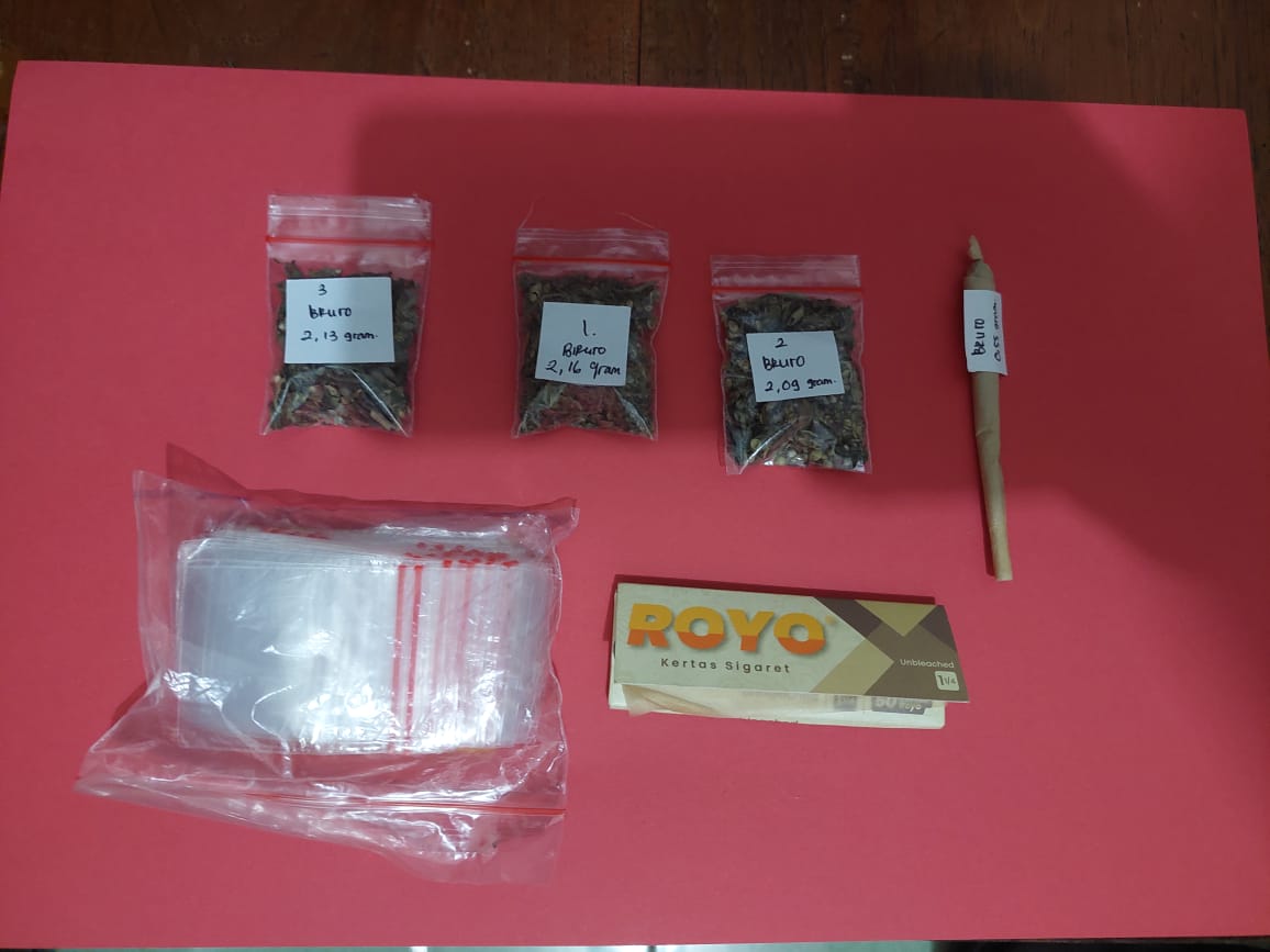 Barang bukti yang diamankan meliputi 3 paket narkotika jenis ganja dengan berat kotor total ± 6,38 gram, 1 linting ganja siap pakai dengan berat bruto ± 0,55 gram dan 19 blister (190 butir) obat keras jenis Alprazolam.