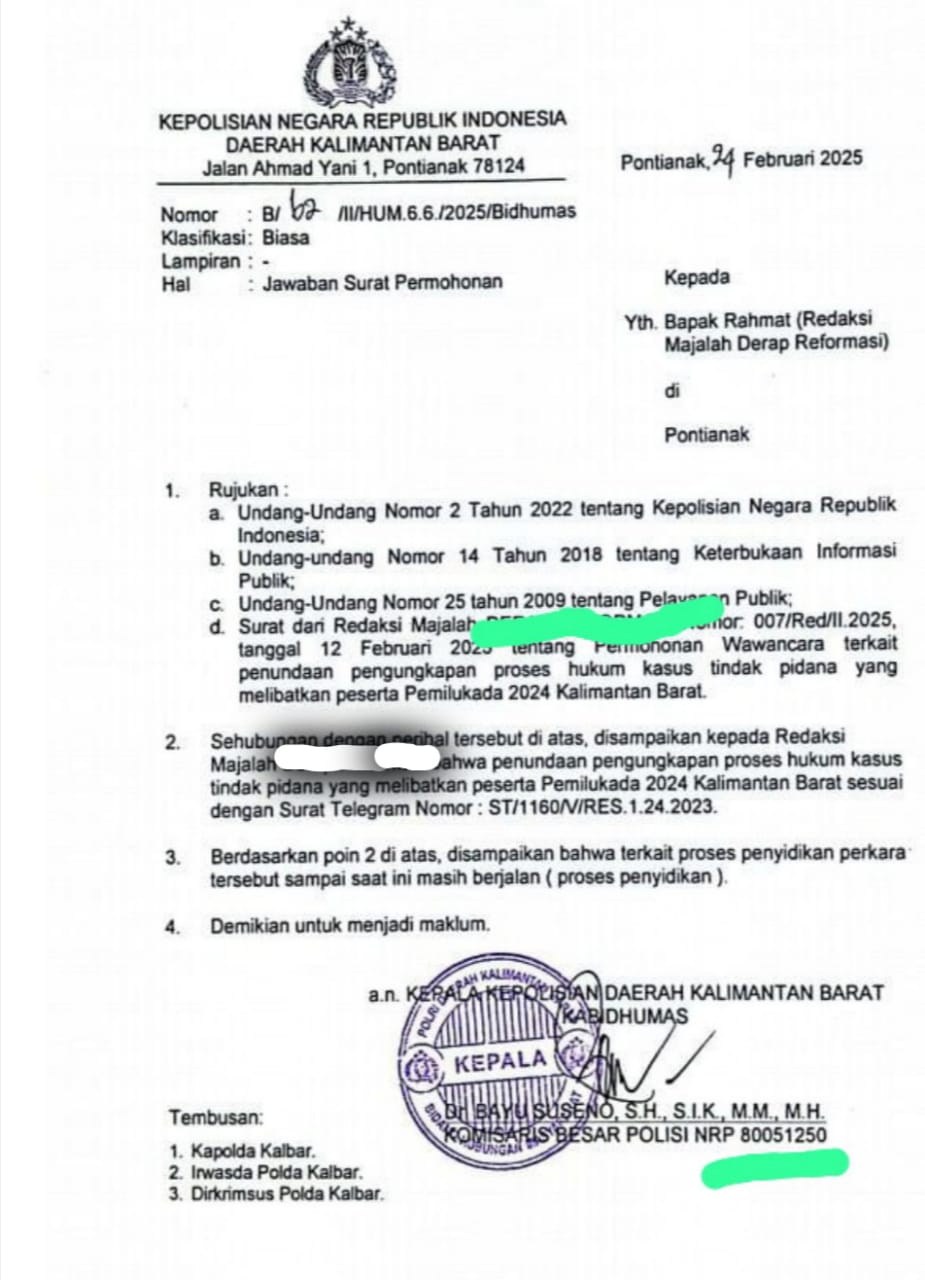 Majalah terbitan nasional pada 12 Februari 2025, mengajukan konfirmasi ulang kepada Kapolda Kalbar terkait tindak lanjut proses hukum terhadap tiga tersangka. Jawaban dari Kabid Humas Polda Kalbar, Dr. Bayu Suseno, menyebutkan bahwa proses penyidikan masih berjalan, namun enggan mengungkap identitas tiga tersangka tersebut?