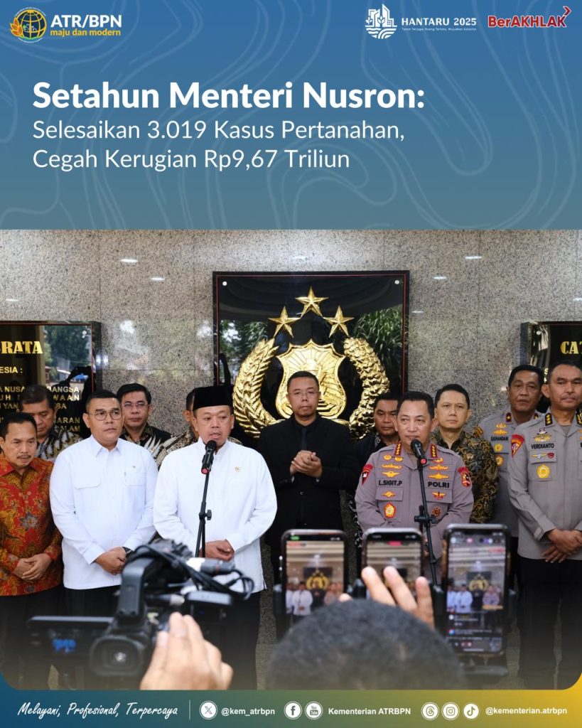 Jakarta – Kementerian Agraria dan Tata Ruang/Badan Pertanahan Nasional (Kementerian ATR/BPN) di bawah kepemimpinan Menteri Nusron Wahid mencatat capaian signifikan dalam penanganan dan penyelesaian konflik pertanahan sepanjang satu tahun terakhir. Melalui langkah cepat dan kolaboratif lintas lembaga, potensi kerugian sebesar Rp9,67 triliun berhasil diselamatkan dari penyelesaian sengketa, konflik, dan perkara pertanahan di berbagai daerah.