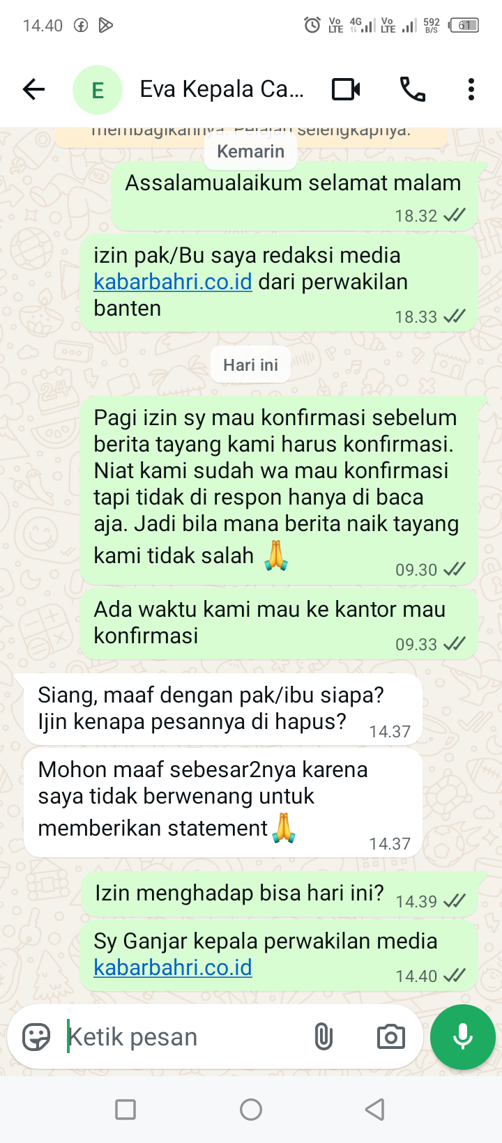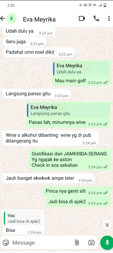 Dugaan tersebut semakin menguat dengan beredarnya percakapan antara sumber dan seseorang yang diduga Pimpinan Cabang Bank Banten Cilegon berinisial Ev. Dalam tangkapan layar, sumber menyinggung soal “wine pemberian Jamkrida yang diminum di kantor saat jam kerja”.