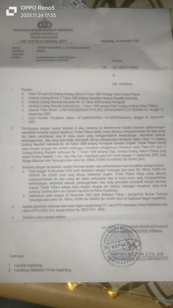 Bengkulu kabupaten-Kepahiang .24 Nopember 2025 Bengkuluketua ormas maju bersama Bengkulu OMBB majelis pimpinan cabang MPC kepahiang mengapresiasi kinerja polres kepahiang Polda Bengkulu,yang mana satreskrim polres kepahiang melalui unit idik 1V PPA polres kepahiang telah menetapkan tersangka kasus asusila yang telah meresahkan warga kepahiang .yang meneror anak di bawah umur .