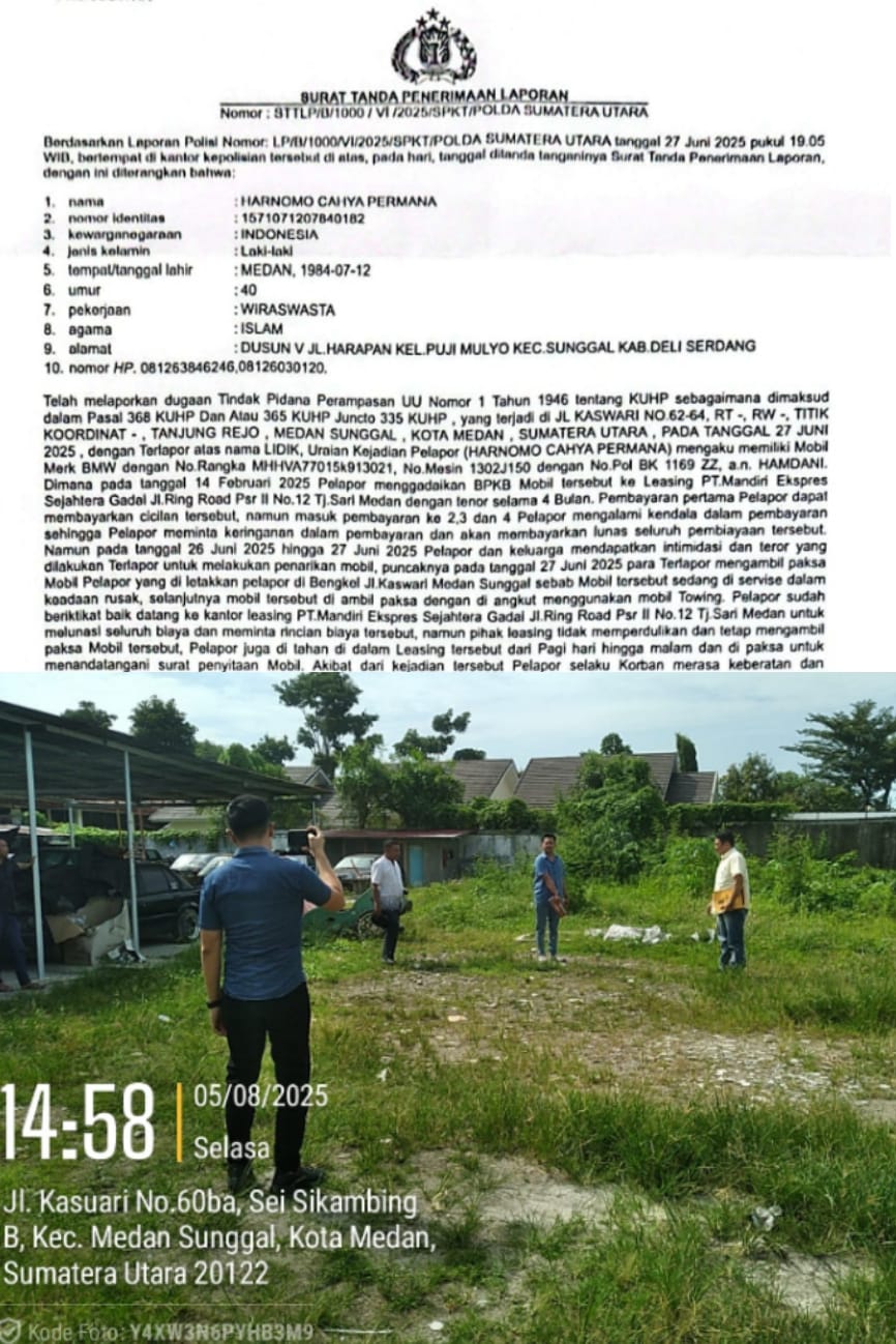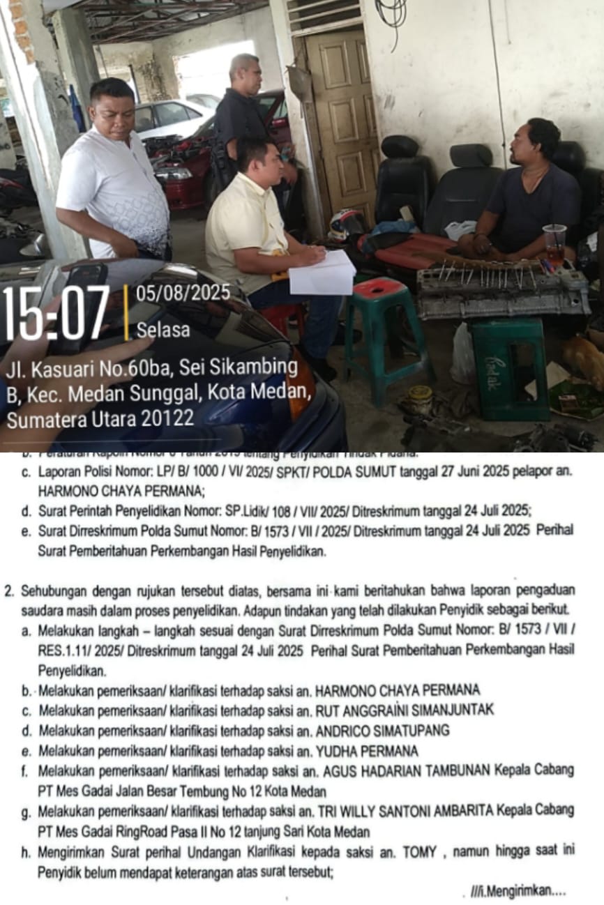 Dalam laporan itu, di bulan Februari 2025 pelapor menjelaskan bahwa ia memiliki satu unit mobil BMW yang telah digadaikan BPKB-nya ke PT. Mes Gadai hingga jelang 2 bulan pihak leasing tersebut melakukan penarikan di salah satu lokasi bengkel mobil di Kota Medan tanpa ada Kehadiran Harmono Chaya dan tanpa adanya konfirmasi Sebelumnya ke dia, sehingga melaporkan ke pihak Kepolisian.