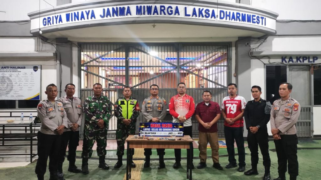 Dalam memperkuat sinergi antar aparat penegak hukum serta menciptakan lingkungan pemasyarakatan yang bersih dari penyalahgunaan narkotika, Lapas Kelas IIB Gunung Sugih melaksanakan razia gabungan bersama Kepolisian Sektor (Polsek) Gunung Sugih dan TNI dari Koramil Gunung Sugih pada, Jumat (10/10) malam.