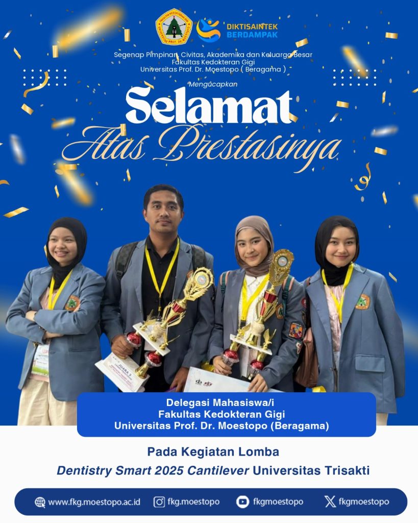 15 November 2025 Fakultas Kedokteran Gigi Universitas Prof. Dr. Moestopo (Beragama) kembali menorehkan prestasi membanggakan setelah berhasil meraih juara, dalam ajang Dentistry Smart (DENSMART) 2025 dengan tema “Cantilever” (Challenging Dentist of Tomorrow to Excel through Clinical and Theoretical Versatility), yang diselenggarakan Universitas Trisakti bertempat di Kampus B, Universitas Trisakti, Jakarta.