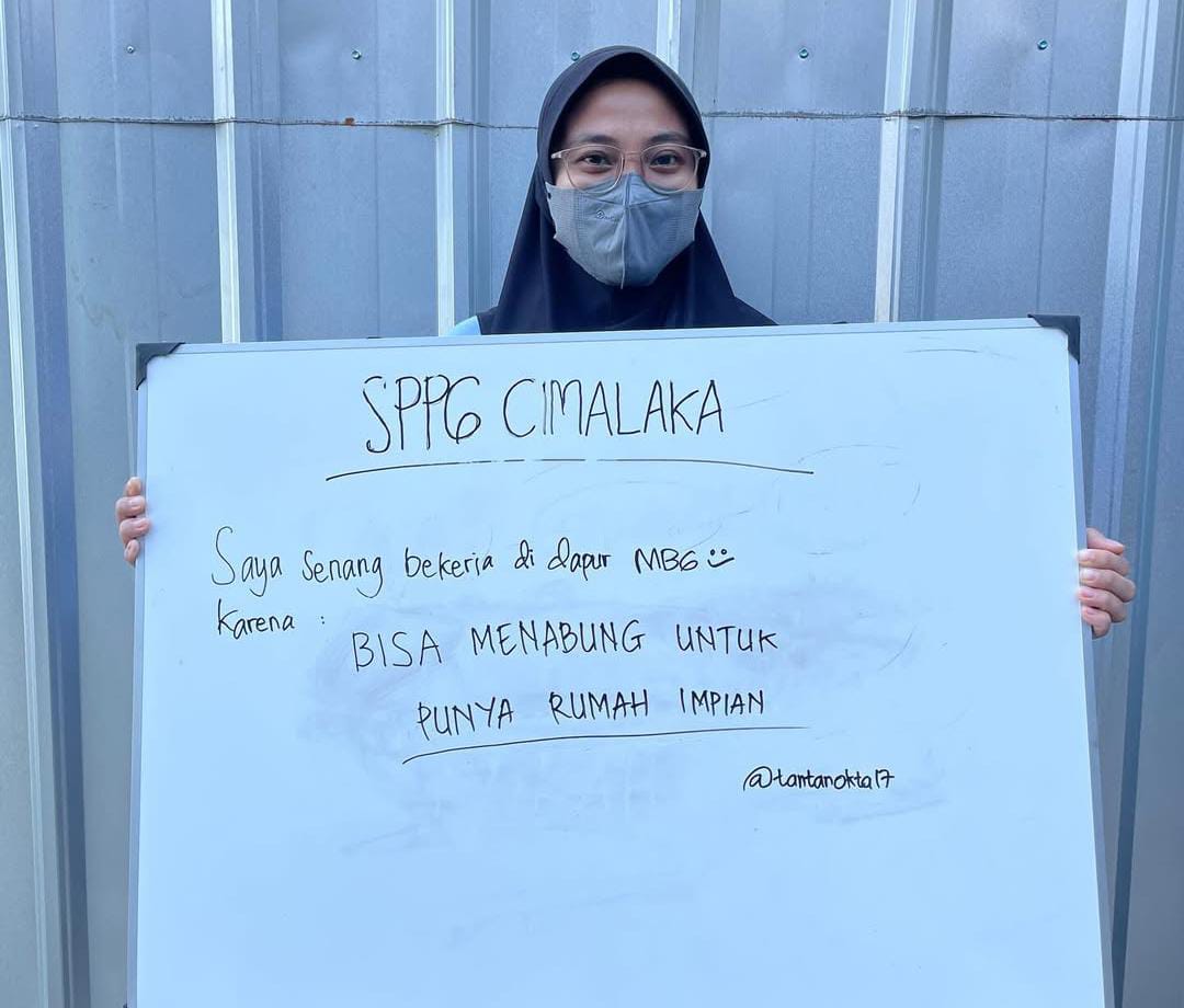 Melalui unggahan di akun @sppgcimalaka, tampak deretan kisah yang dituliskan para pekerja dengan menggunakan whiteboard kecil. Tulisan sederhana itu justru memuat cerita yang menyentuh hati, tentang rasa syukur sekaligus harapan baru bagi mereka yang kini bekerja di dapur MBG.