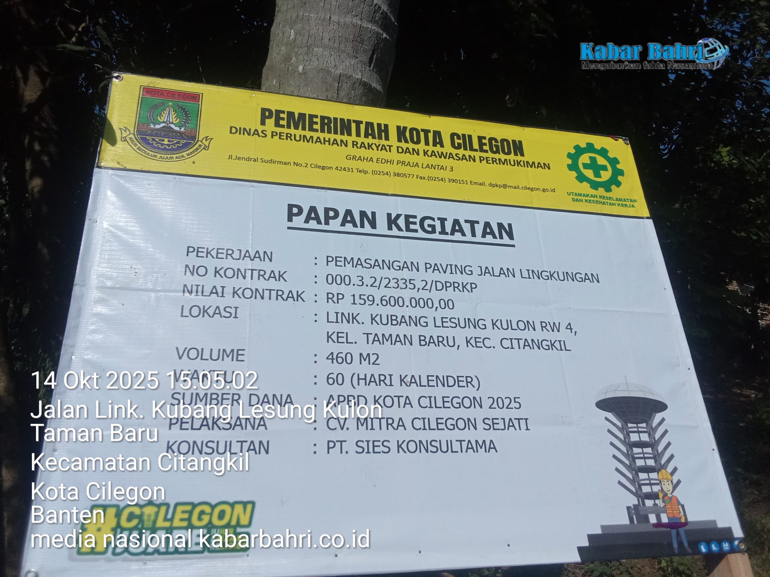 Dari pantauan awak media di lokasi proyek pada Selasa 14/10/2025 tidak ada pengawas dari Cv mitra cilegon sejati maupun Konsultannya, Bahkan dari pengawas kelurahan pun tidak terlihat. Padahal pemasangan paving block merupakan proyek pemerintah yang didanai oleh Anggaran Pendapatan dan Belanja Daerah (APBD), Harusnya ada pengawasan oleh pihak berwenang seperti kelurahan dan dinas terkait .