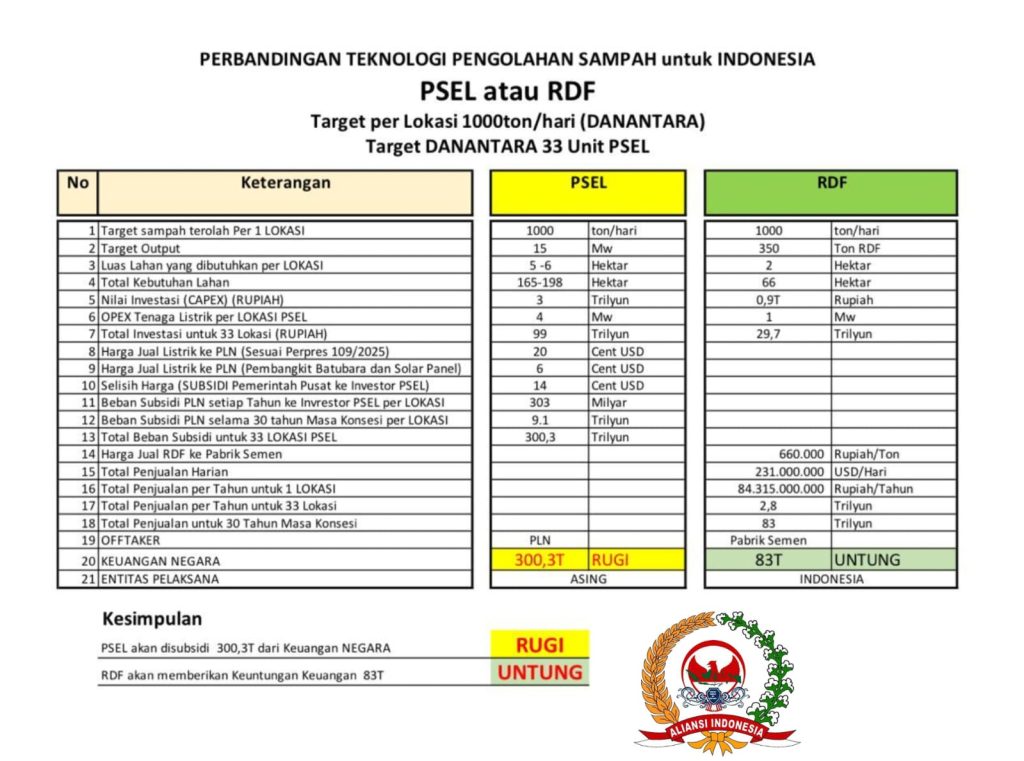 Jakarta, Ambisi pemerintah melalui Danantara Grup untuk menjadikan Pembangkit Listrik Tenaga Sampah (PSEL) sebagai solusi strategis nasional kini menghadapi gelombang kritik dan kecurigaan publik. Di tengah sorotan terhadap inefisiensi proyek bernilai Rp 3,2 triliun per kota atau per lokasi, berpotensi adanya penyimpangan dan korupsi dalam pelaksanaan di sejumlah daerah.