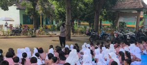 Bhabinkamtibmas Polsek Beji, Brigpol Andriyani, memberikan penyuluhan tentang bahaya bullying dan pentingnya keselamatan berlalu lintas kepada para siswa SDN Sidowayah 1, Beji.