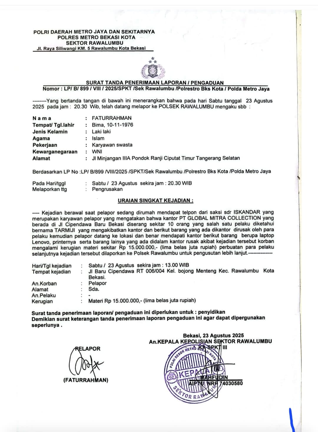 Berdasarkan Nomor: LP/B/899/VIII/2025/SPKT/Sek Rawalumbu/Polrestro Bks Kota / Polda Metro Jaya, kasus “Pengrusakan” yang terjadi di lokasi PT GLOBAL MITRA COLLECTION yang berada di Jl Cipendawa Baru Bekasi Jawa Barat pada Sabtu 23 Agustus 2025.