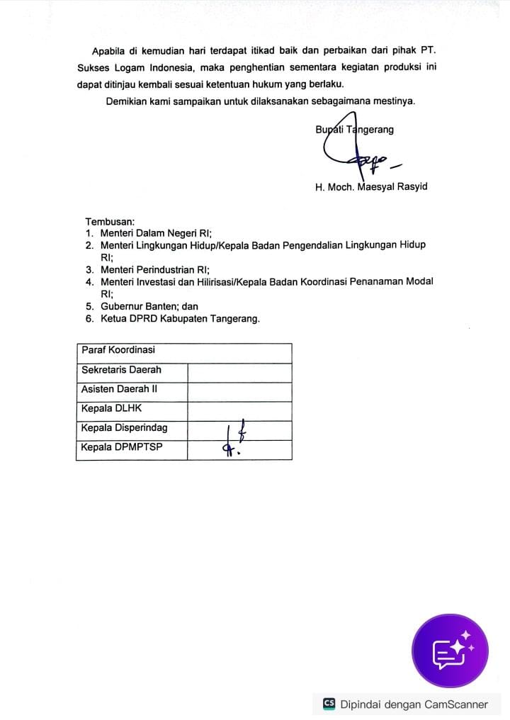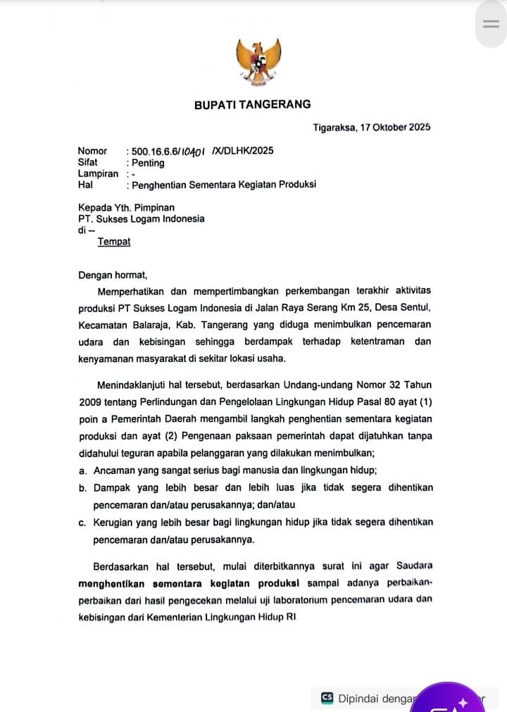 Kabupaten Tangerang – Bau menyengat dan suara mesin yang tak pernah berhenti di malam hari membuat warga Desa Sentul, Balaraja, resah. Keluhan demi keluhan sudah disampaikan sejak lama. Tapi, baru setelah videonya viral di media sosial, langkah tegas muncul: Bupati Tangerang menghentikan sementara aktivitas PT Sukses Logam Indonesia (PT SLI). Warga sekitar menyebut udara di kawasan itu kerap berbau seperti logam terbakar. Beberapa warga bahkan mengaku mengalami sesak napas dan batuk yang tak kunjung hilang. “Kami sudah lama protes, tapi selalu mental. Tidak ada hasil,” kata seorang warga yang enggan disebut namanya.