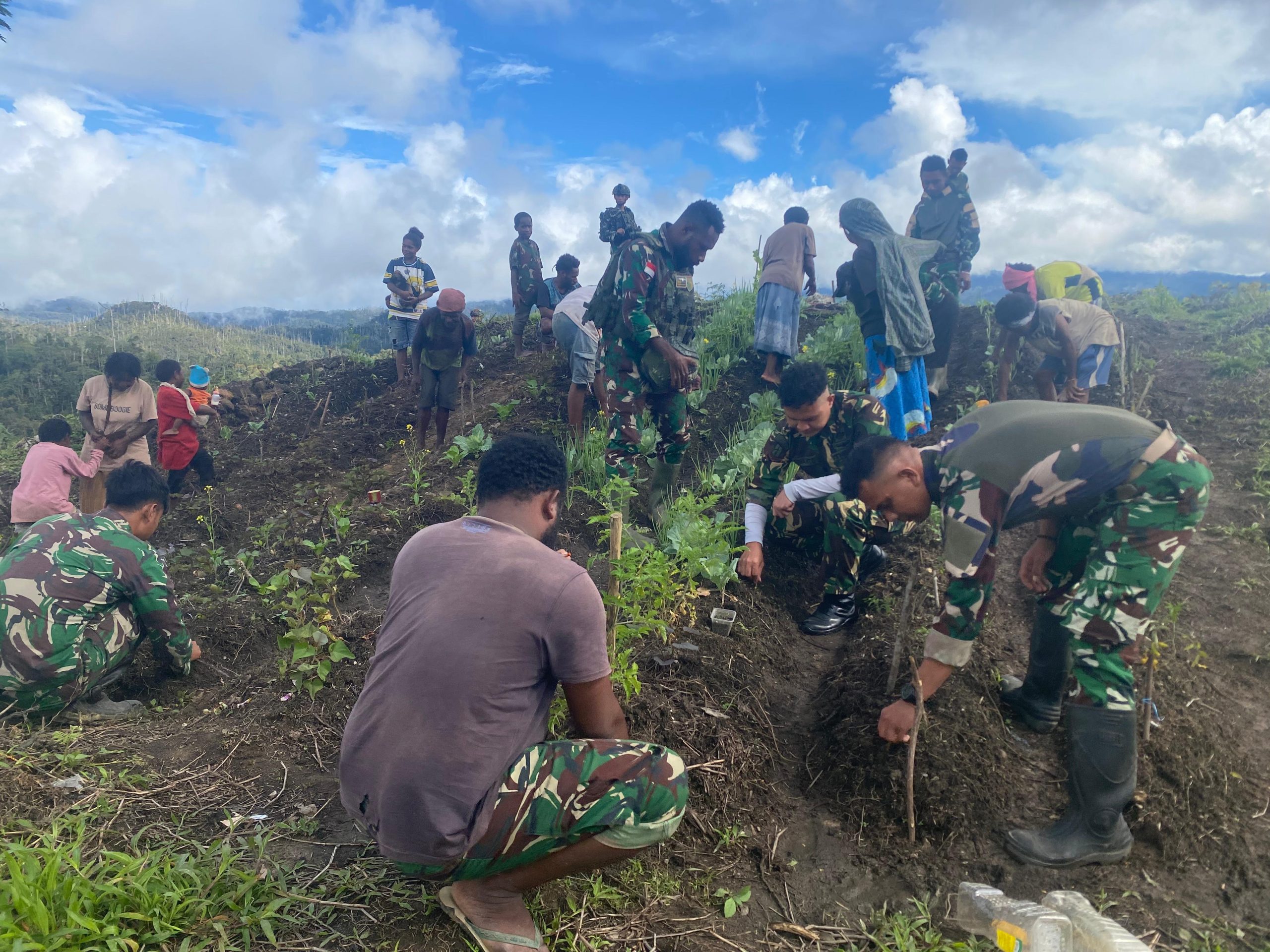 Menariknya, bibit sayuran diperoleh langsung dari masyarakat sekitar, dan proses penanaman dilakukan bersama-sama, menciptakan suasana penuh gotong royong dan kekeluargaan antara prajurit dan warga. Kebersamaan ini menjadi simbol kuat bahwa TNI tidak bekerja sendiri, tetapi tumbuh dan berkembang bersama rakyat.