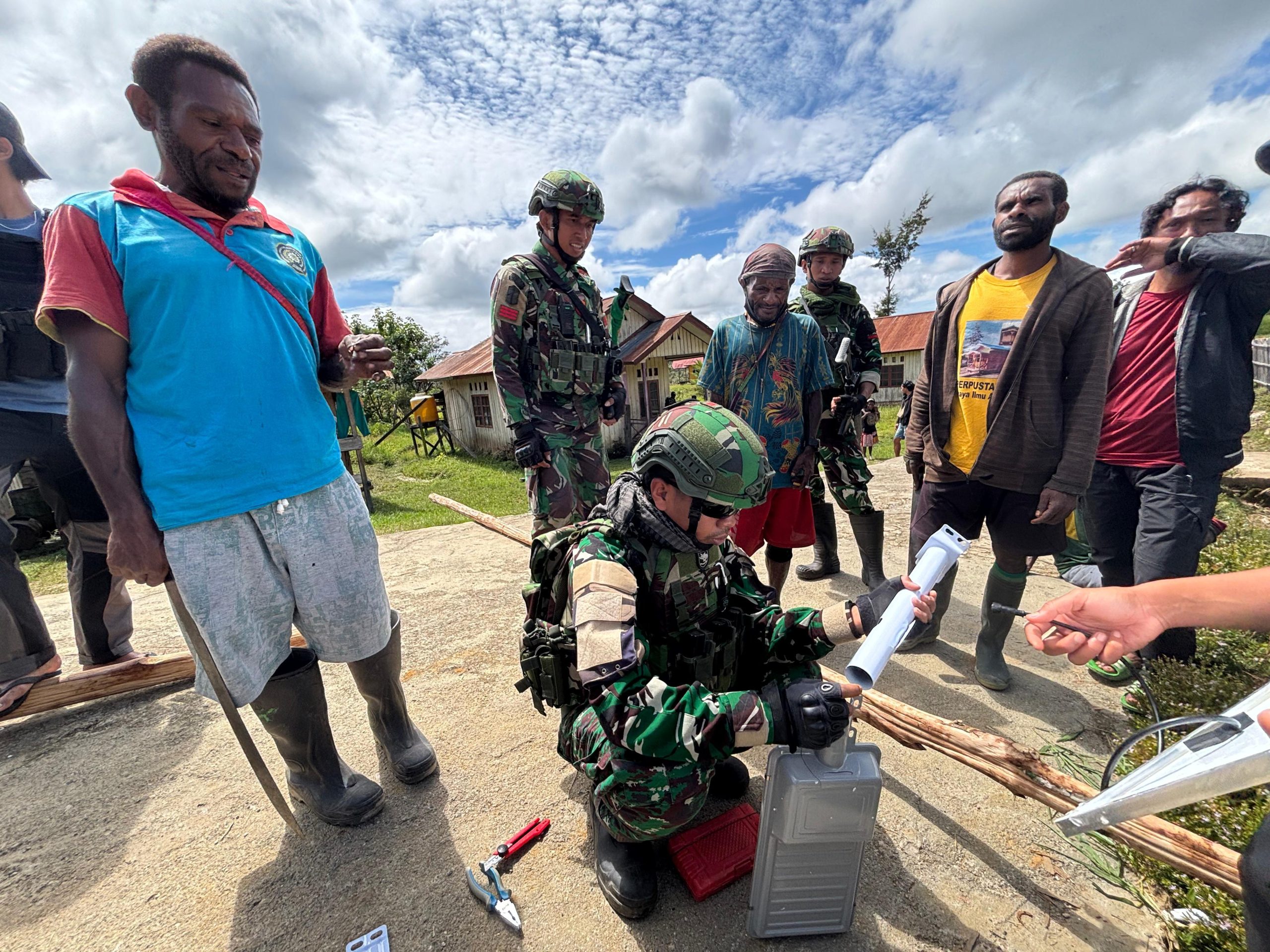 Pos Serambakon Satgas Pamtas RI–PNG Yonif 751/Vira Jaya Sakti (VJS) yang dipimpin Danpos Letda Inf Ilham Putra melaksanakan penyerahan lampu tenaga surya (solar cell) kepada warga Kampung Wanbakon, Distrik Serambakon, sebagai dukungan pemenuhan kebutuhan penerangan pada wilayah yang masih minim akses listrik.