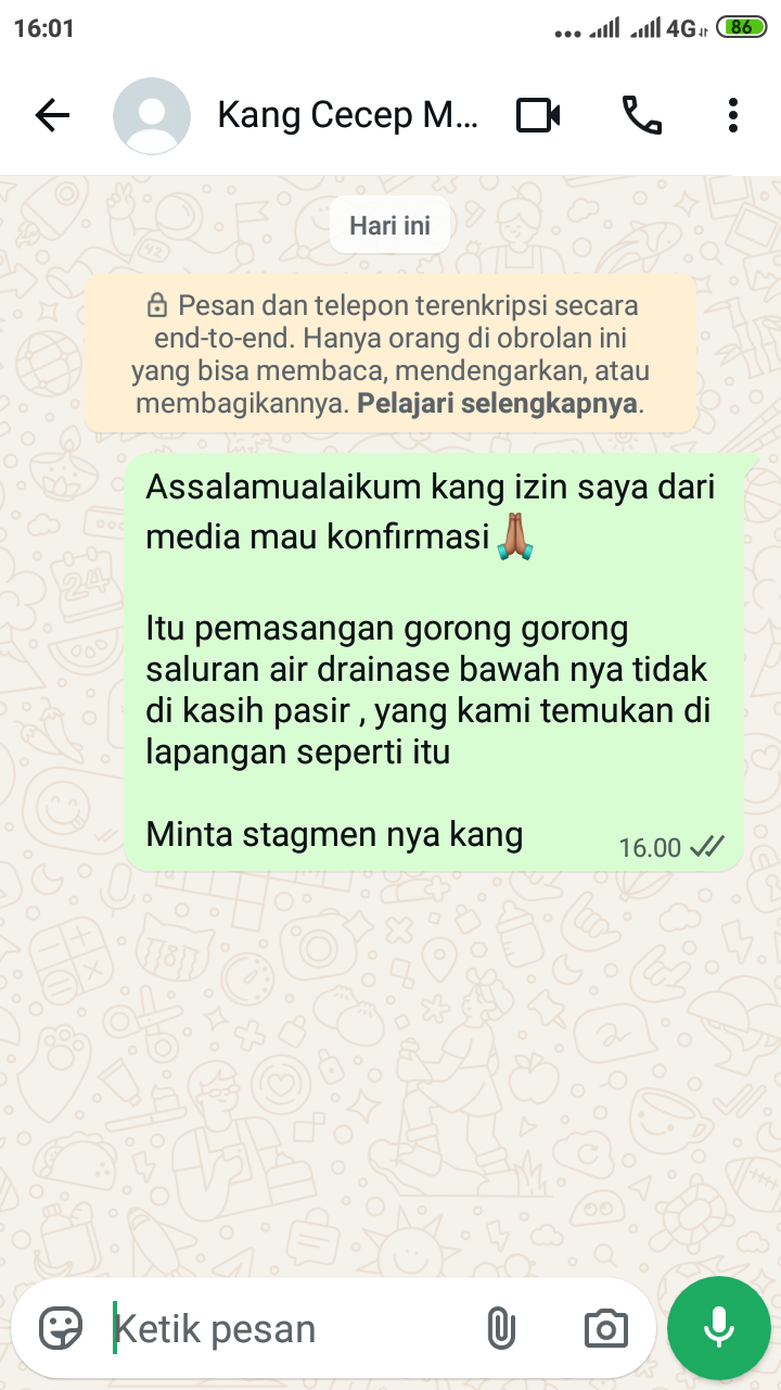 Saat wartawan mencoba mengkonfirmasi kepada pengawas mandor lewat pesan WhatsApp untuk menanyakan terkait proyek drainase tersebut tidak merespon sama sekali.