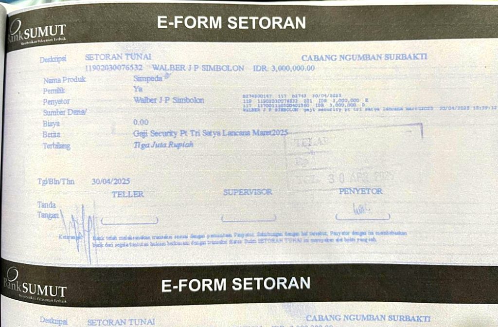 Saat dikonfirmasi oleh wartawan, HRD Ibu Eva mengatakan langsung bahwa, “PT. TSL tidak ada potong gaji mereka sama sekali pak sejak Januari 2025, kenapa didaftarkan di bulan april?, karena dari Bulan Januari hingga Maret para karyawan proses pencairan dari Biro Outsourcing A2P yang lama, dimana gaji Rp3.000.000 kita transfer langsung 3 Juta, dan sama sekali tidak ada dipotong, kalau biaya potongan transfer sebesar Rp 2.500, itu dari pihak bank sehingga mereka terima sebesar Rp2.997.500.”, ucapnya saat diwawancarai di Kantor PT. TSL.