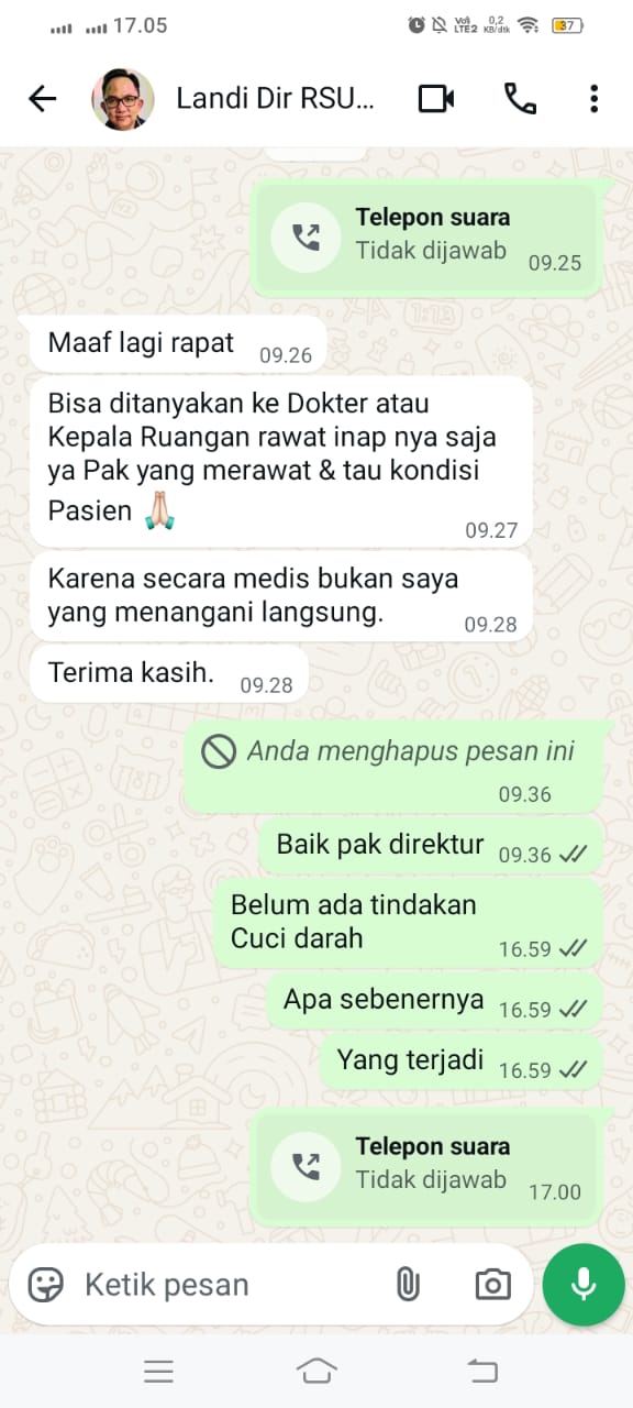 Lanjut tadi Saya mencoba kompermasi melalui via w,a kepada pihak direktur RSUD bapak dr. H. Lendy Delyanto, MARS.