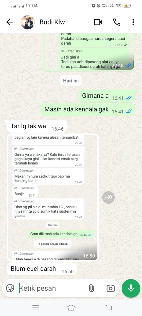Berdasarkan laporan informasi dari keluarga pasien yang masuk pada hari Jum’at tanggal 31 Oktober 2025 dengan diagnosis gagal ginjal stadium,5 (lima) dengan fungsi ginjal 7% yang seharusnya sudah ada tindakan secara medis dengan cara cuci darah.