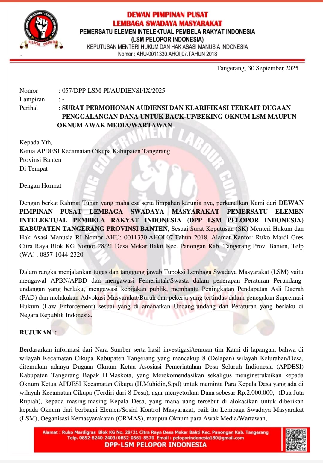 Menanggapi fenomena ini, Heru, Sekretaris Jenderal DPP LSM Pelopor Indonesia Kabupaten Tangerang, menyatakan pihaknya telah melayangkan surat permohonan audiensi dan klarifikasi resmi kepada Ketua APDESI Kecamatan Cikupa dan Ketua APDESI Kabupaten Tangerang.