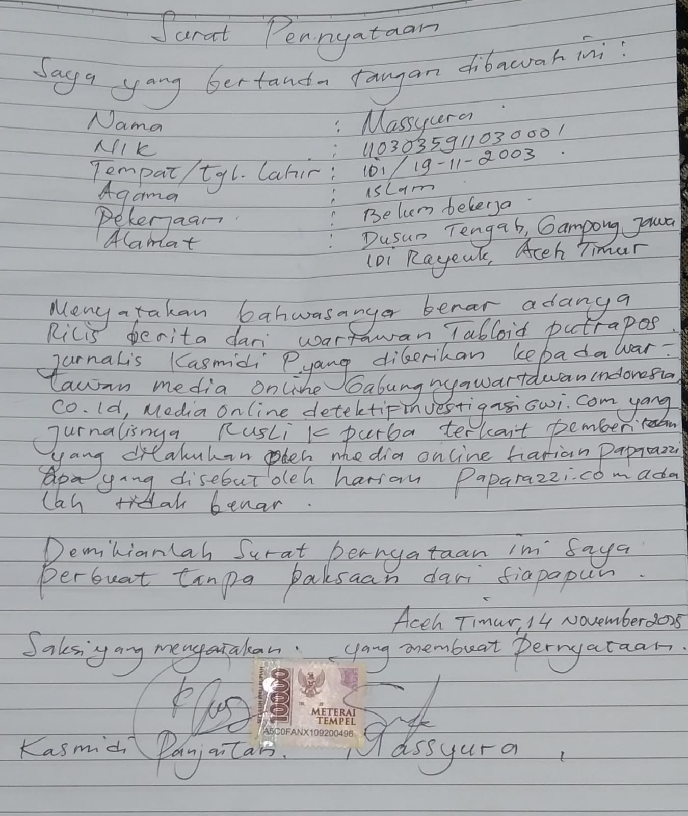 Dengan surat pernyataan korban “massyura” tersebut, di bubuhkan di atas materai Rp.10.000 rupiah. Berlambangkan burung garuda republik indonesia, menyebutkan pernyataannya itu. “Saya yang bertanda tangan di bawah ini, nama. Massyura, nomor induk kartu (nik). 113035911030001, tempat tanggal lahir. Idi, 19/11/2023. Agama Islam, pekerjaan. Belum bekerja, warga kecamatan idi rayeuk kabupaten aceh timur. Menyatakan, bahwasanya benar adanya rilis berita dari wartawan tabloid putra pos. Jurnalis kasmidi panjaitan, yang di beritakan kepada wartawan media online gabungnyawartawanindonesia.co.id. Media online detektifinvestigasi.com, yang jurnalisnya berinislal R.K.P.