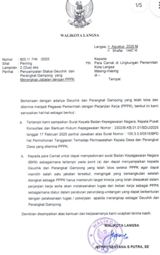Sesuai pula, adanya terkait terbitnya surat edaran wali kota langsa “Jefri Santana S Putra SE”. Yang di tujukan ke para camat dan para geuchik juga ke perangkat desa se-pemko langsa, yang rangkap jabatan PPPK (paruh waktu) di gampong. Pada tanggal, 15 agustus 2025 beberapa bulan yang lalu. Yang berbunyi dalam surat edaran wali kota langsa tersebut, “dengan nomor surat. 800,1/3143/2025. Sifat, penting. Lampiran, 2 (dua) eks. Perihal, penyampaian status geuchik dan perangkat gampong. Yang berangkat jabatan, dengan PPPK, di lanjuti dengan narasi surat edaran tersebut. Berkenan dengan adanya geuchik dan perangkat gampong yang telah lolos.