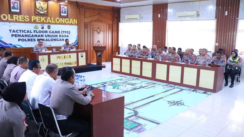 PEKALONGAN – Kabarbahri. co. id – Polres Pekalongan – Polda Jateng – Dalam rangka mengantisipasi potensi unjuk rasa memperingati satu tahun pemerintahan Presiden Prabowo Subianto dan Wakil Presiden Gibran Rakabuming Raka, Polres Pekalongan menggelar Tactical Floor Game (TFG) pengamanan aksi massa di wilayah Kabupaten Pekalongan.