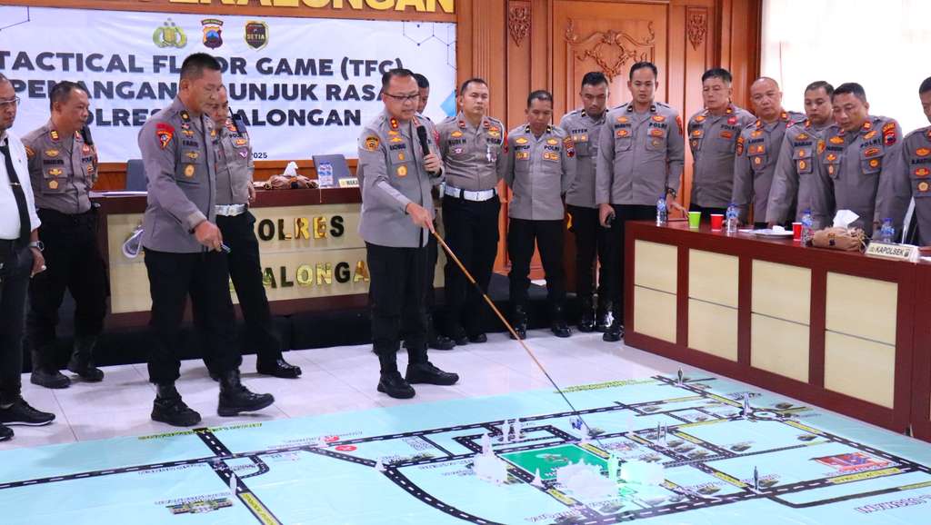 PEKALONGAN – Kabarbahri. co. id – Polres Pekalongan – Polda Jateng – Dalam rangka mengantisipasi potensi unjuk rasa memperingati satu tahun pemerintahan Presiden Prabowo Subianto dan Wakil Presiden Gibran Rakabuming Raka, Polres Pekalongan menggelar Tactical Floor Game (TFG) pengamanan aksi massa di wilayah Kabupaten Pekalongan.
