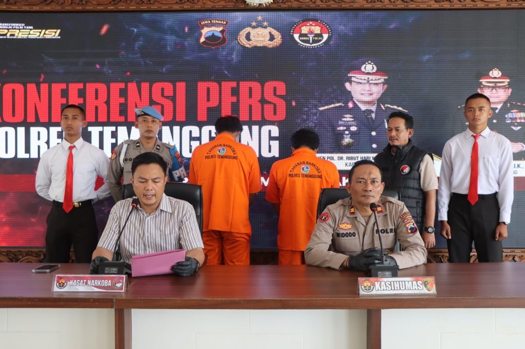 TEMANGGUNG – gabungnyawartawanindonesia.co.id./ Satresnarkoba Polres Temanggung, Polda Jateng berhasil mengamankan dua orang warga Ngadirejo atas kasus peredaran Narkoba jenis Sabu, kedua tersangka yang berhasil diamankan MF (26), yang berstatus buruh, dan AE (23), seorang karyawan swasta, yang terlibat dalam modus operandi unik yang disebut “membetrek” sabu.