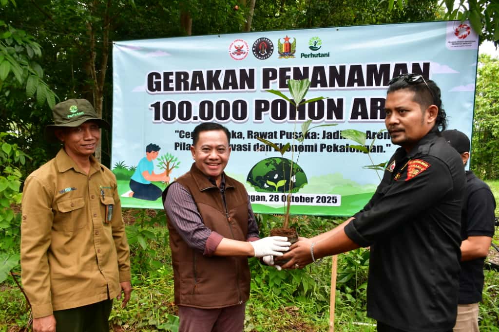 KAJEN – Kabarbahri. co. id – Bupati Pekalongan diwakili Wakil Bupati (Wabup) Pekalongan, Sukirman, ikut serta dalam kegiatan penanaman pohon aren yang diselenggarakan oleh organisasi masyarakat Grib Jaya dan LSM Sodo Lanang Nuswantoro bekerja sama dengan Perum Perhutani Kesatuan Pemangkuan Hutan (KPH) Pekalongan Timur di lahan Perhutani Desa Bukur, Kecamatan Bojong, Selasa (28/10/2025) siang.
